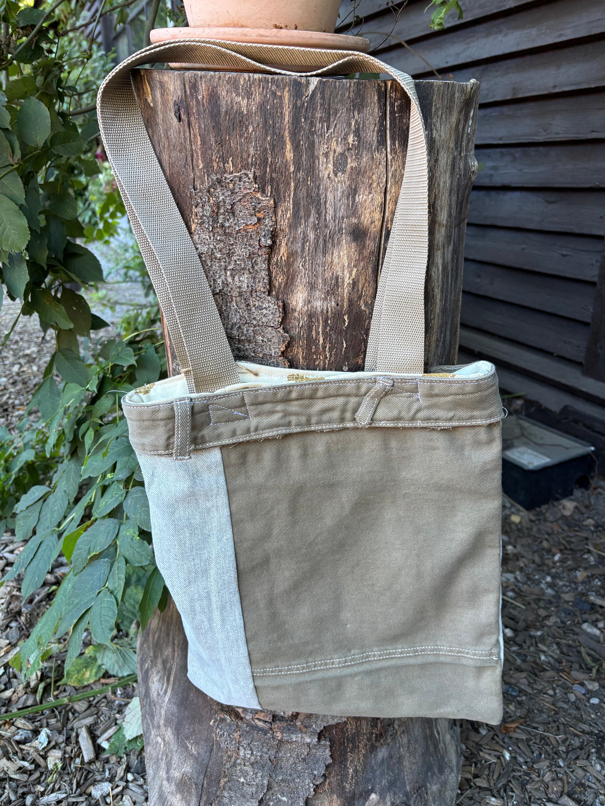 This tote pairs muted grey and beige denim with earthy tones for a subtle, understated look.