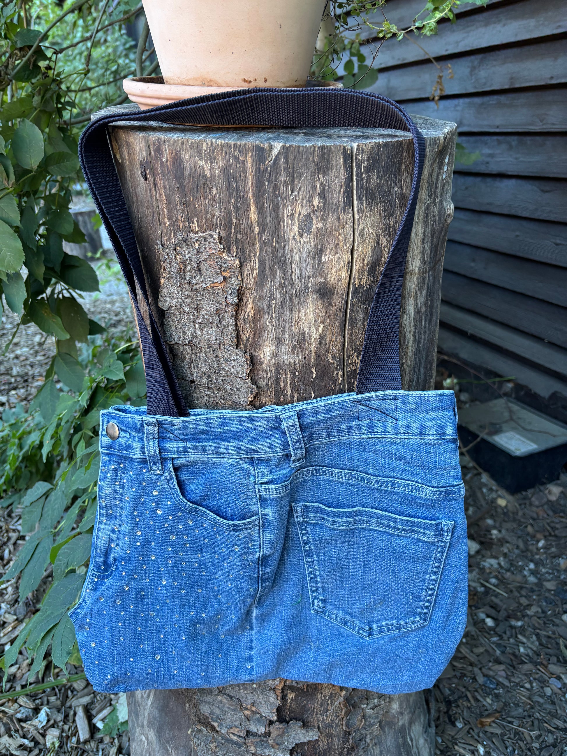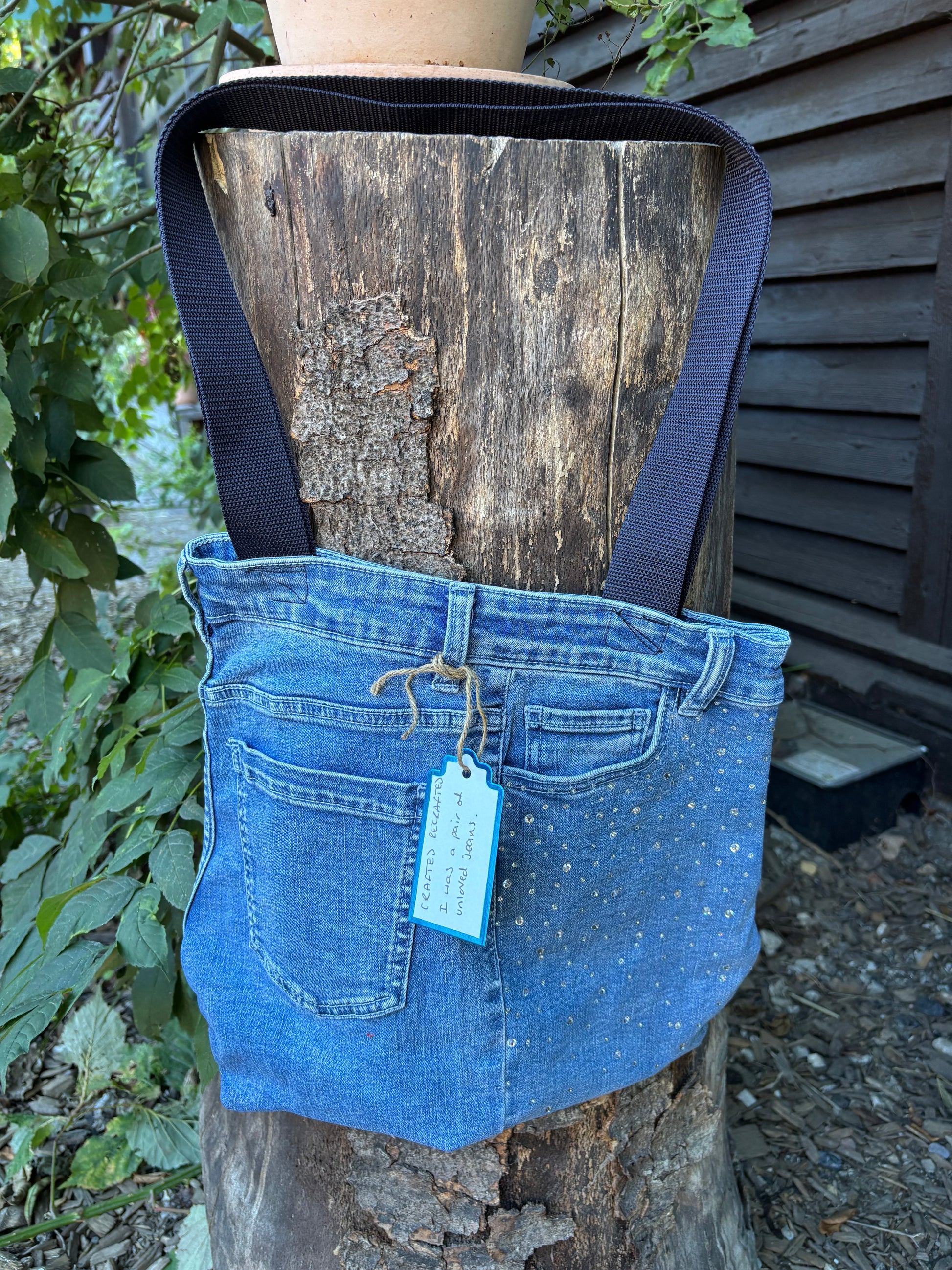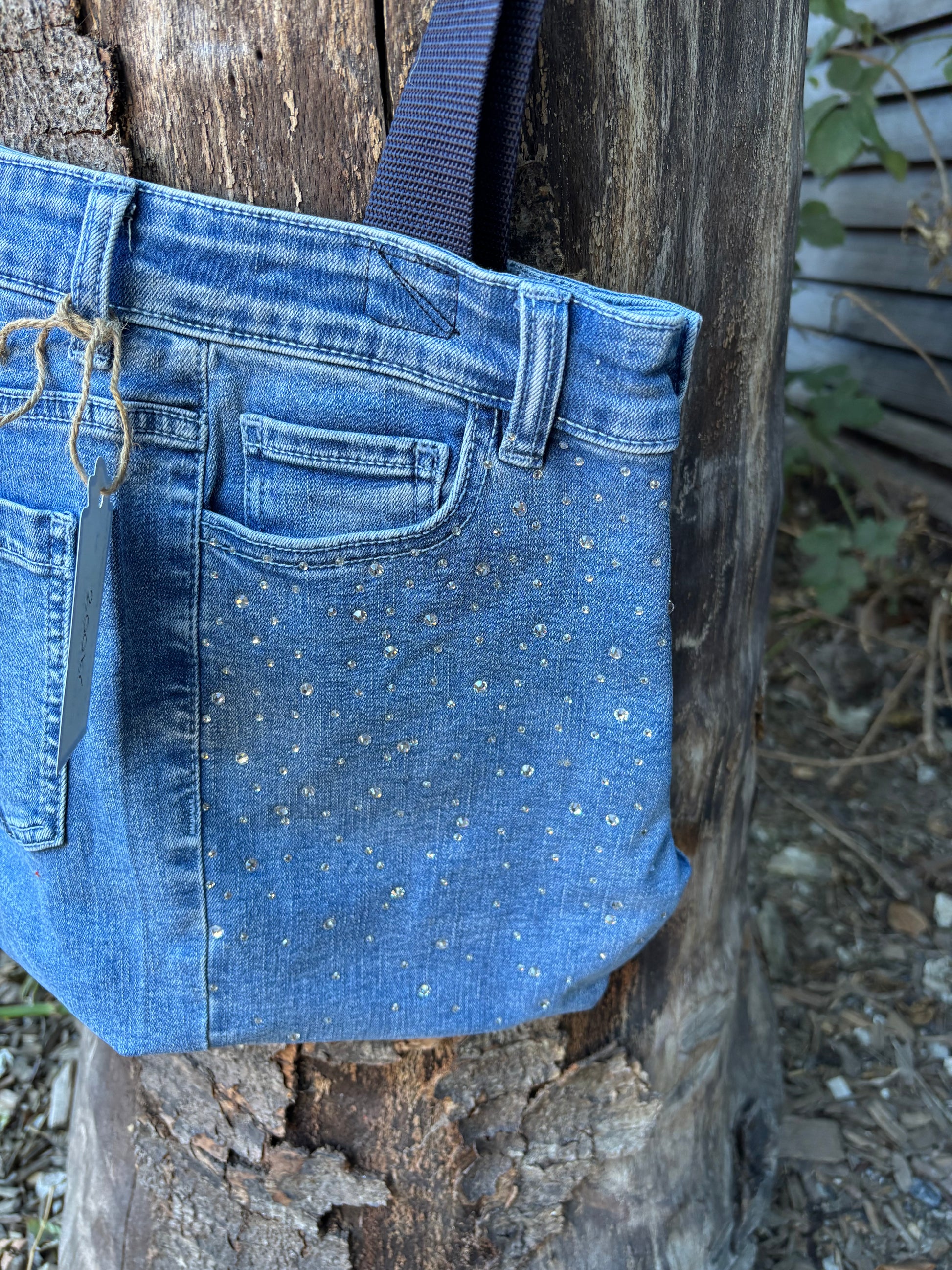Made from reclaimed jeans, Stardrop turns casual denim into something magical. Scattered rhinestones catch the light like tiny constellations, adding just the right amount of shine.