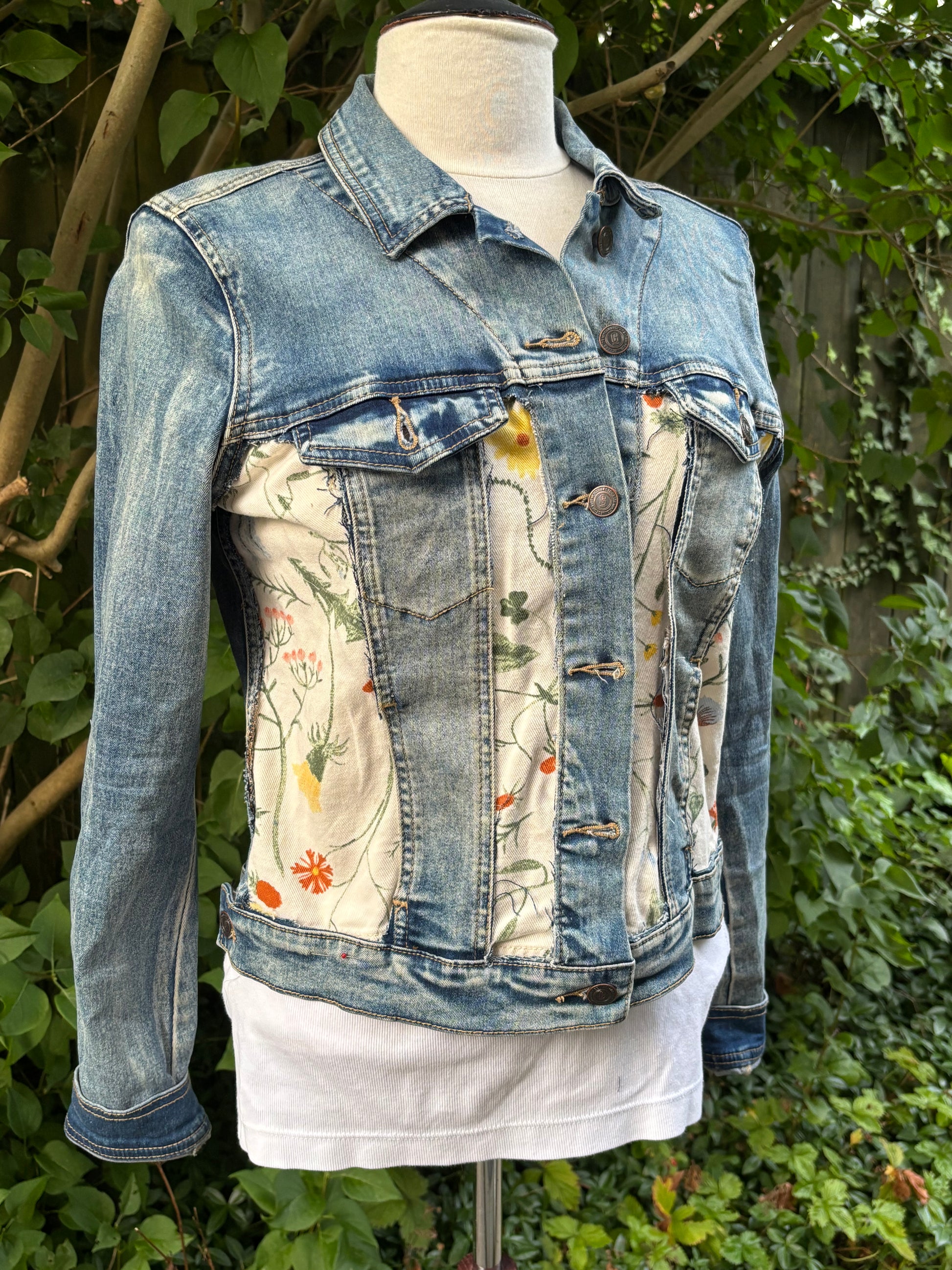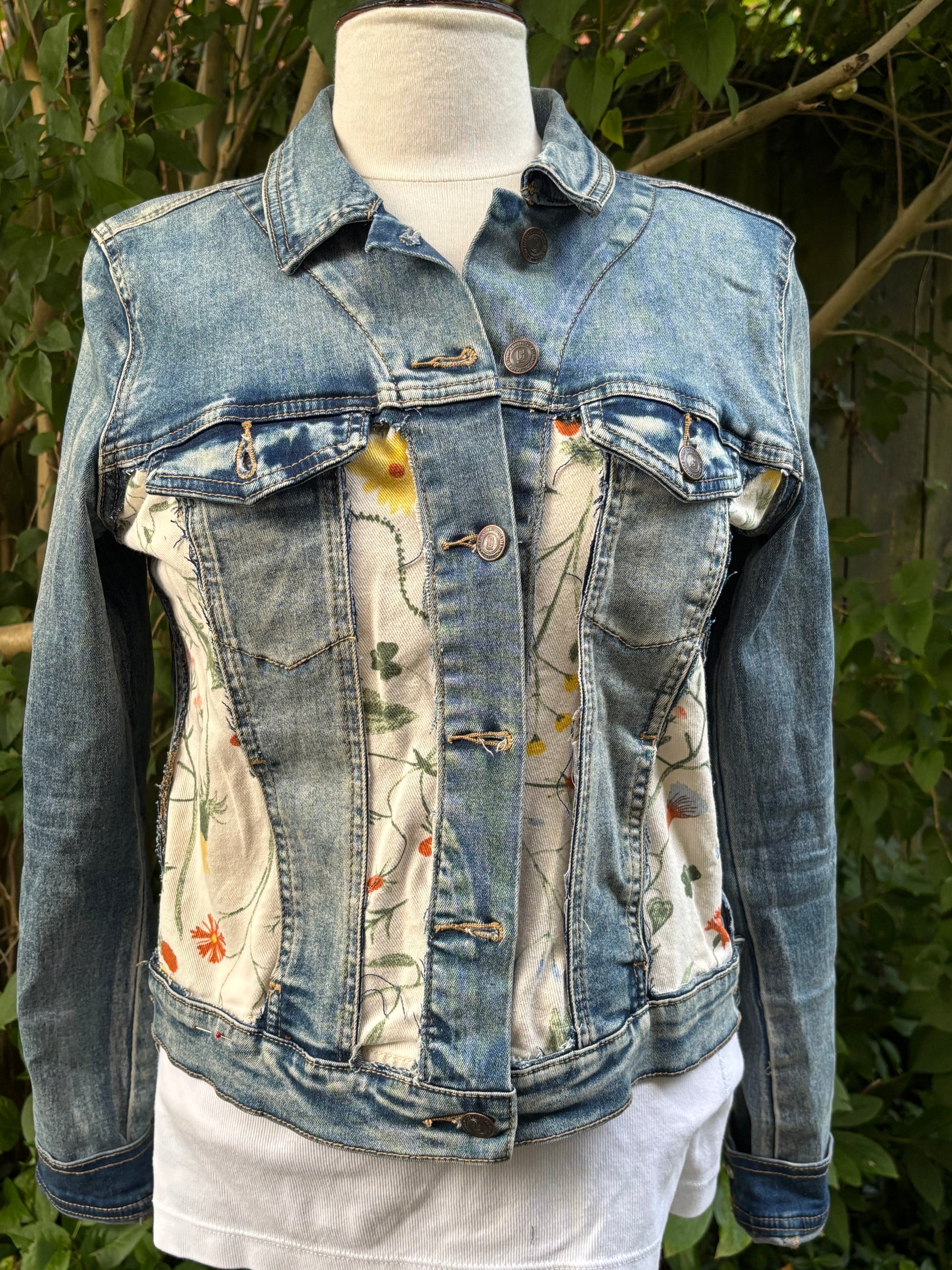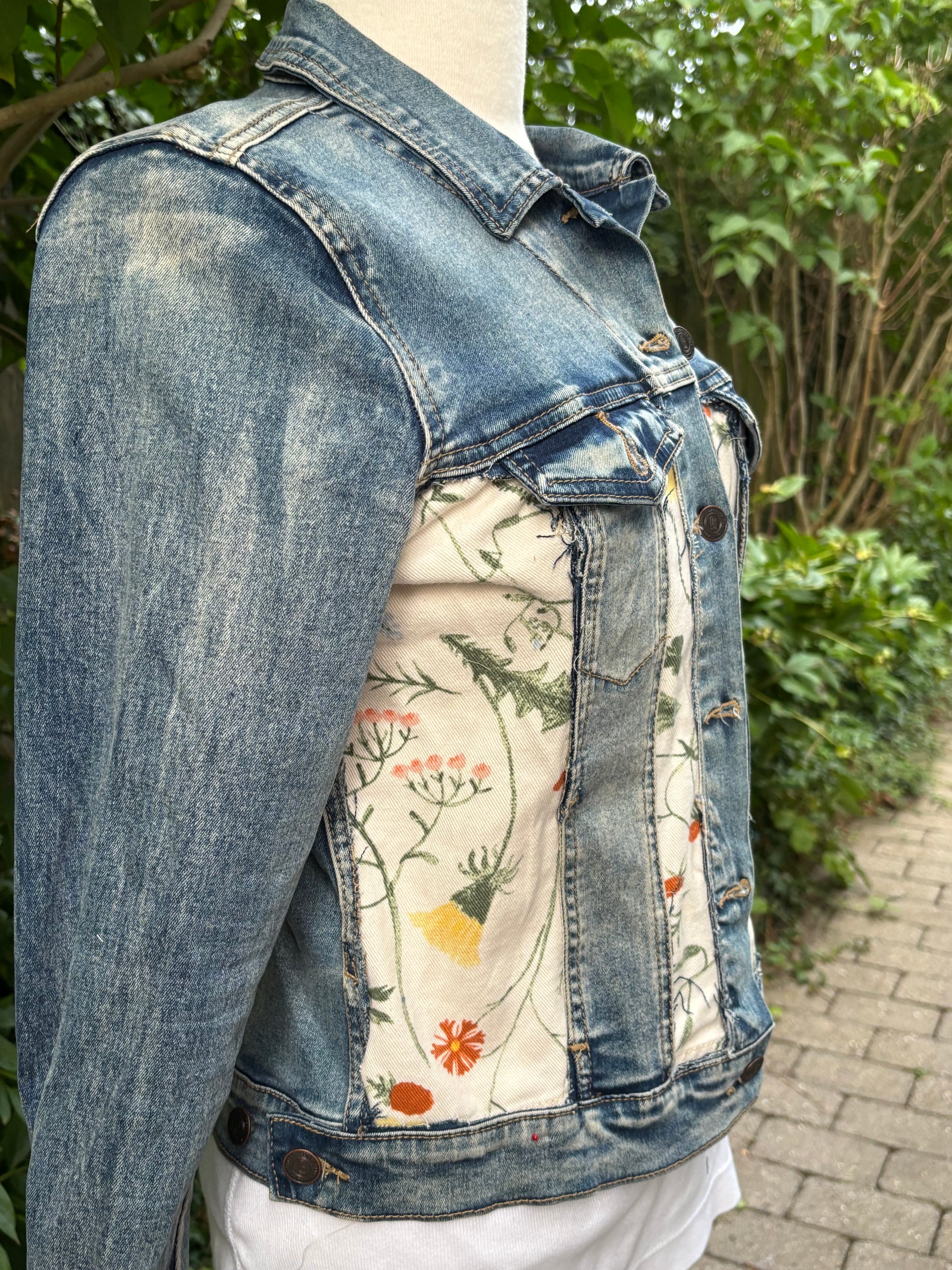 The softly faded blue feels like a well-loved jacket, while the floral fabric adds a gentle, nature-inspired touch.
